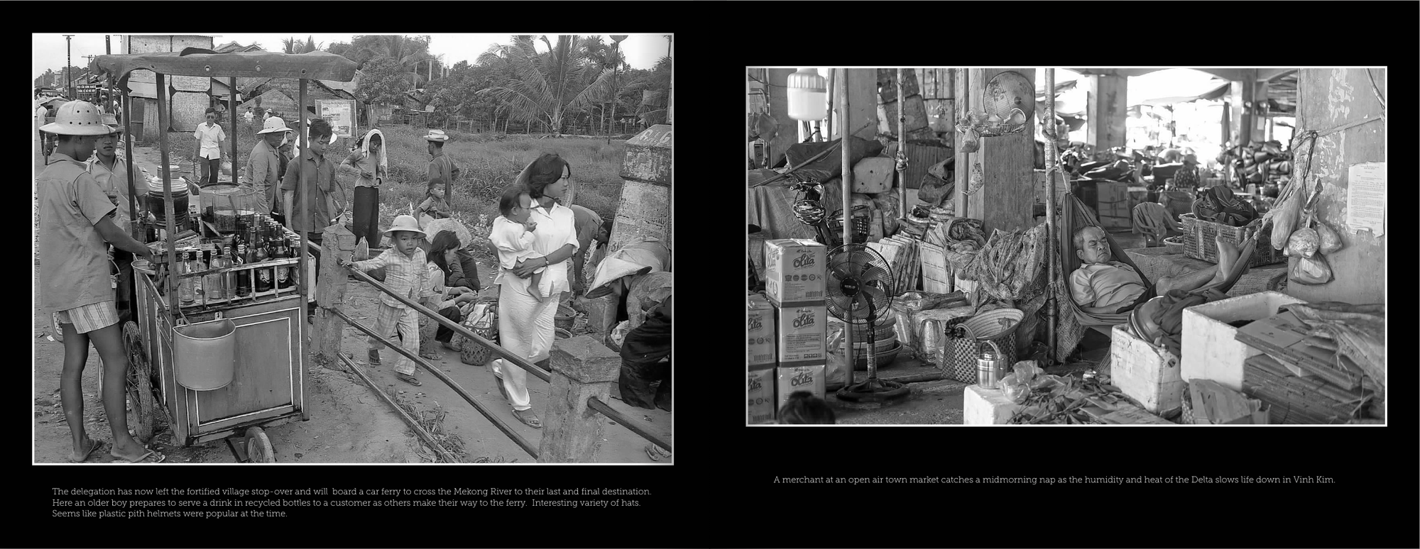 The delegation has now left the fortified village stop-over and will board a car ferry to cross the Mekong River to their last and final destination. Here an older boy prepares to serve a drink in recycled bottles to a customer as others make their way to the ferry. Interesting variety of hats. Seems like plastic pith helmets were popular at the time.