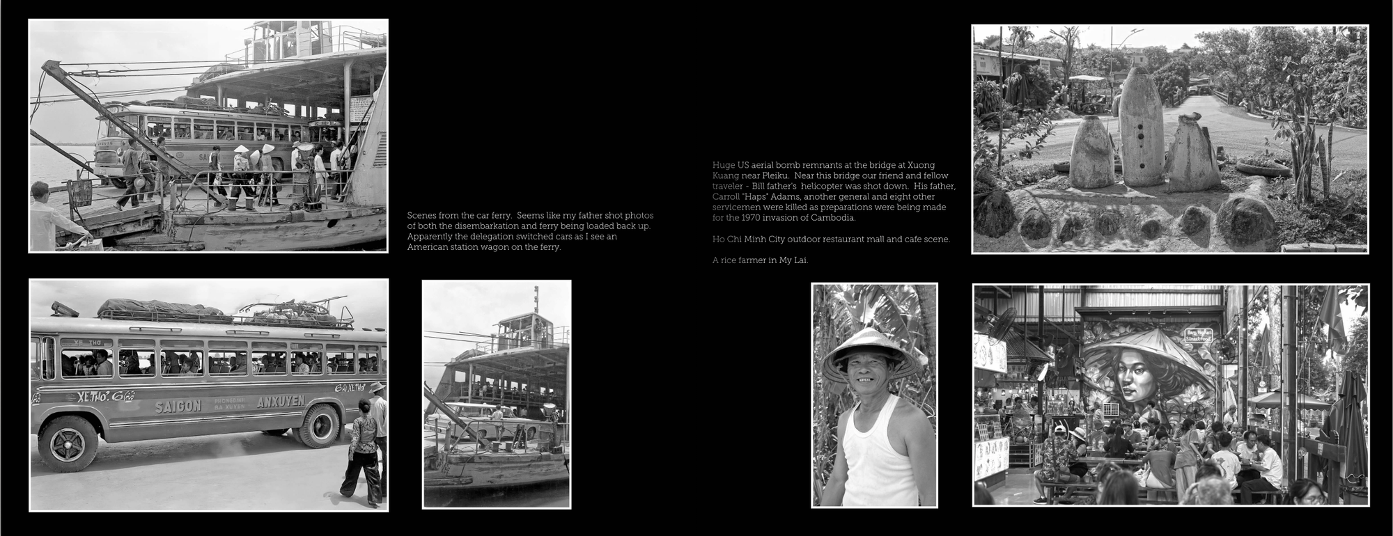How they arrived and left, I have no idea, but presume from information I gathered from a friend that worked with USAID under my father, that they probably came in via helicopter. Where in the Delta they visited, I’m not sure. However ,there is a Saigon-Anxuyen bus that is pictured on the ferry. Anxuyen is