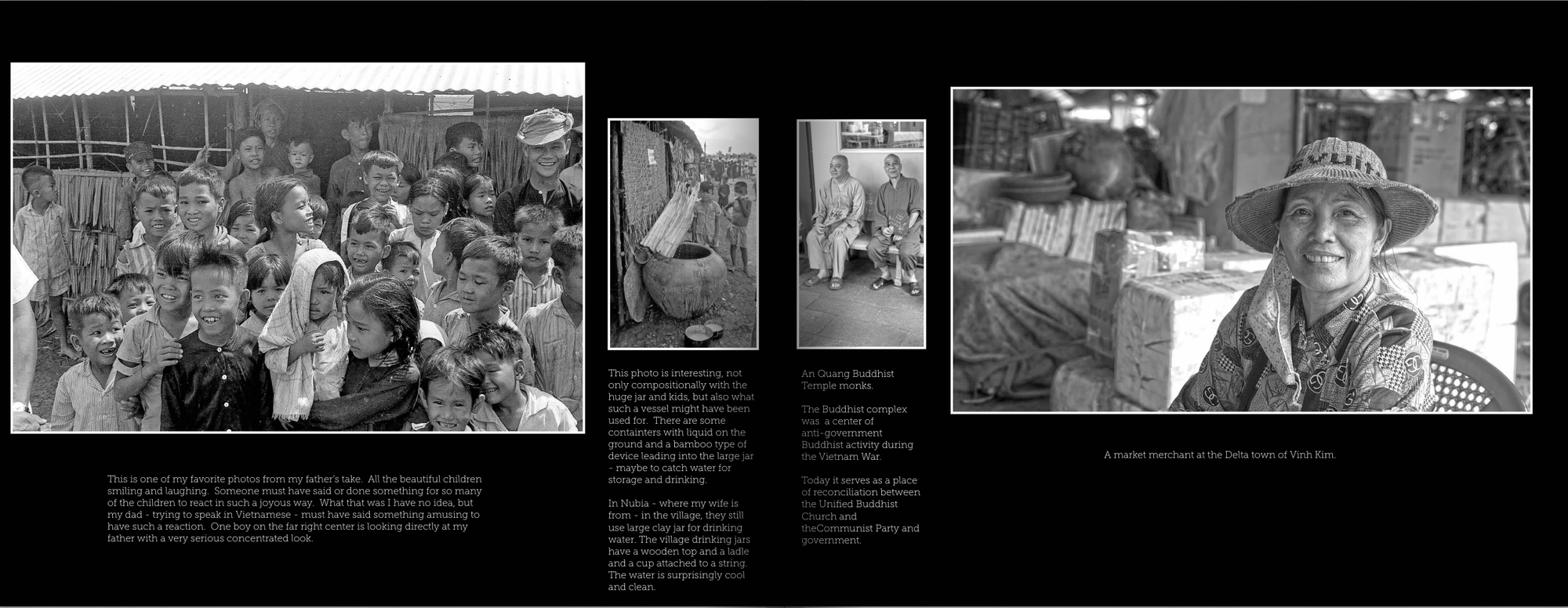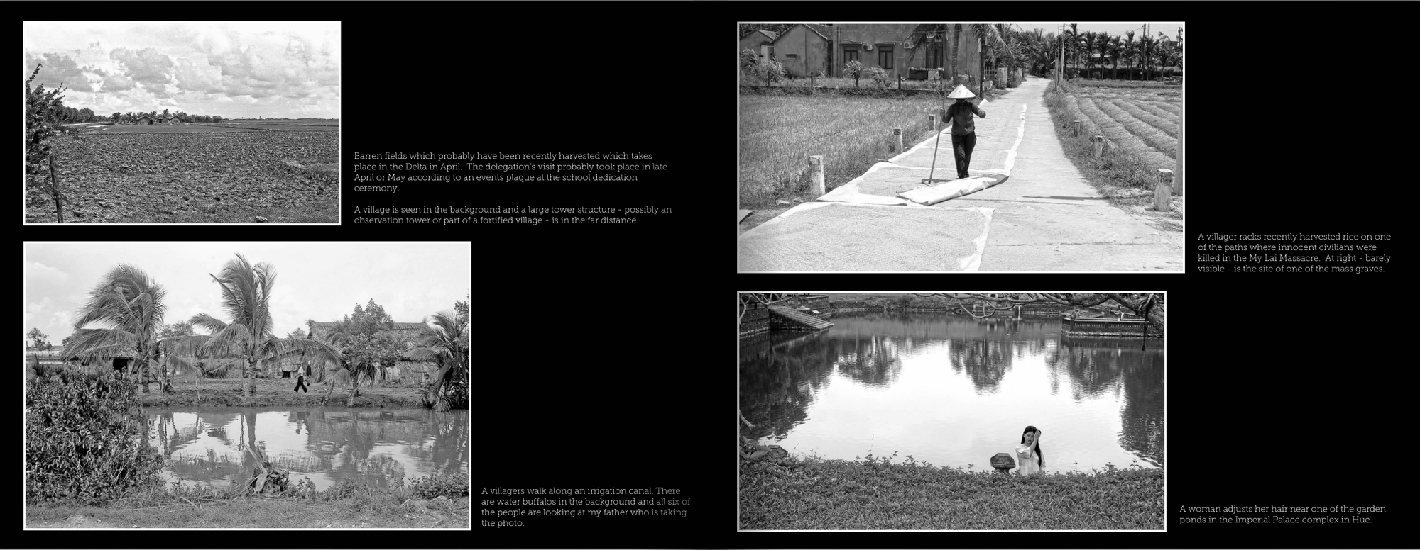 Last year I took a trip to Vietnam and as part of my documentation I took photographs with my camera set on black and white with a 50mm lens. Years ago I came across a sheet of negatives of pictures my father took in 1966 on a one day visit to Vietnam's Delta. He served with the US government in Vietnam from 1965 to 1968. This is his only roll of B/W film that I have of his.